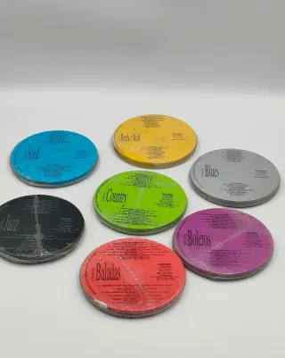 ¡Para amantes de la música y el coleccionismo! Vendo lote de la serie musical "Siente". Son 7 CDs presentados en exclusivas y decorativas cajas metálicas circulares. Cada disco incluye una selección de 12 grandes éxitos en sus versiones originales. Géneros incluidos: 🎸 Rock & Roll (Amarillo) 🎷 Jazz (Negro) 🎻 Country (Verde) 🎤 Soul (Azul) 🎸 Blues (Plateado) 💃 Boleros (Morado) 🌹 Baladas (Rojo) ➡️ Conservados en su embalaje original (ver fotos). Ideal tanto para escuchar como para colecciónar.