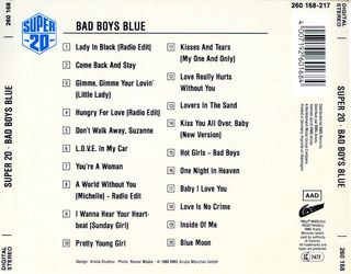 Álbum recopilatorio de Bad Boys Blue. - Incluye 20 éxitos. You’re a Woman Pretty Young Girl I Wanna Hear Your Heartbeat (Sunday Girl) Kisses and Tears (My One and Only) Lady in Black A World Without You (Michelle) I Love You Come Back and Stay Gimme Gimme Your Lovin’ Hungry for Love Turquoise Lovers in the Sand L.O.V.E. in My Car How I Need You A Train to Nowhere Mon Amie Don’t Walk Away Suzanne I’m Not a Fool Love Really Hurts Without You Deep in My Emotion