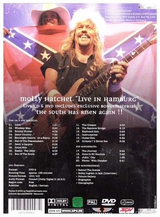 DVD de Molly Hatchet: Concierto en Hamburgo. Incluye un CD en vivo adicional. El DVD y el CD están en una caja protectora. - Incluye temas como 'Flirtin' with Disaster', 'Whiskey Man', 'Bounty Hunter', 'Gator Country', 'Fall of the Peacemakers' y 'Son of the South', entre otros. - El DVD se ve en muy buen estado.