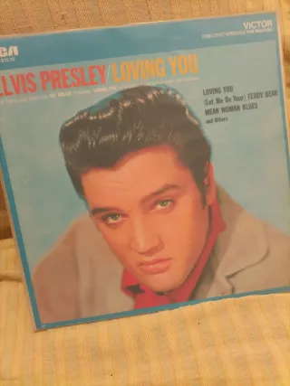 Disco de vinilo de Elvis Presley, Loving You. - Incluye canciones como Loving You, Teddy Bear y Mean Woman Blues. - Edición Victor RCA. - Portada con imagen de Elvis Presley.