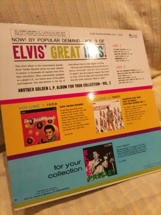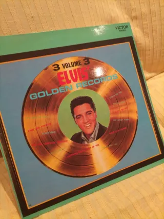 Vinilo de Elvis Presley, Golden Records Volume 3. - Portada con imagen de Elvis. - Diseño inspirado en un disco de vinilo con títulos de canciones. - Sello discográfico Victor Stereo.