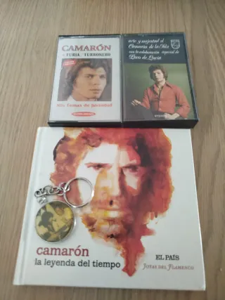 Conjunto de artículos del legendario Camarón de la Isla. - Cassette Mis Temas de Juventud (Edición Limitada). - Cassette Arte y Majestad con colaboración de Paco de Lucía. - Libro Camarón: La Leyenda del Tiempo (El País - Joyas del Flamenco). - Llavero con medalla conmemorativa.