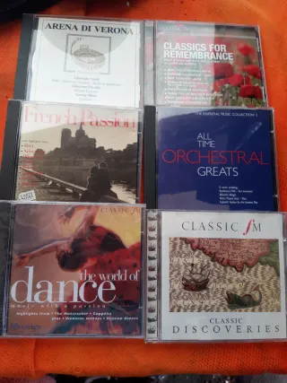 Conjunto de 6 CDs de música clásica con diversas colecciones. - Arena di Verona - French Passion - Classics for Remembrance - All Time Orchestral Greats - The World of Dance - Classic Discoveries
