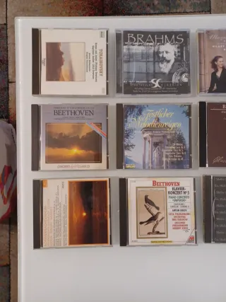 Lote de CDs de música clásica con obras de compositores como Beethoven, Brahms y Chopin. - Incluye grabaciones de piano y conciertos. - Diversas obras y sonatas.