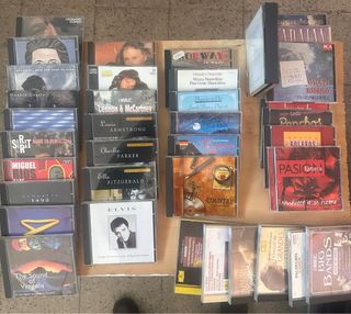 Gran lote de más de 40 CDs de música variada, incluyendo artistas como Joaquín Sabina, Joan Manuel Serrat, Leonard Cohen, Elvis Presley, y música country. - Artistas destacados: Joaquín Sabina, Joan Manuel Serrat, Leonard Cohen, Elvis Presley, Louis Armstrong, Charlie Parker, Ella Fitzgerald, Vangelis, Miguel Ríos. - Géneros: Pop/Rock Nacional e Internacional, Jazz, Country, Latino, Clásica, Compilaciones. - Títulos visibles: El Hombre del Traje Gris (Sabina), Serrat - Nadie es Perfecto, Songs from the Road (Cohen), The Essential Collection (Elvis), Country (varios artistas), Pasión Latina, Música Boleros, Grandes Orquestas, Pachel