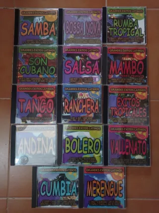 Colección de CDs de música latina con grandes éxitos. - Samba - Bossa Nova - Rumba Tropical - Son Cubano - Salsa - Mambo - Tango - Ranchera - Éxitos Tropicales - Andina - Bolero - Vallenato - Cumbia - Merengue
