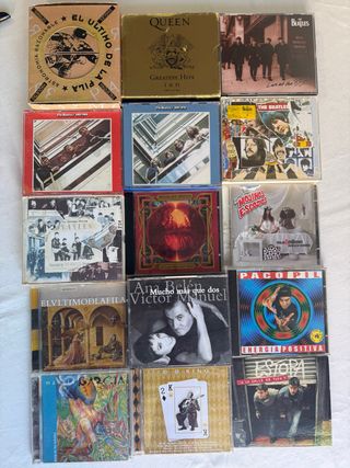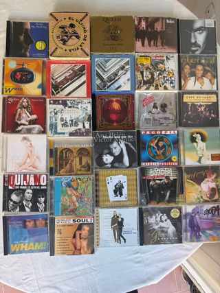 30CDS,pero como muchos de ellos son dobles hay un total de 42 incluso una caja que lleva 6 CD el último de la fila, CD doble de Queen, astronomía razonable, edición limitada con seis CD cuatro CD dobles de los Beatles CD doble Mojinos Escozios CD doble Ana Belén Víctor Manuel mucho más que dos Paco Pill tres CD de Gloria Estefan, dos CD de Café Quijano, Shakira eternal Phil Collins, wham roxette Manolo García B.B. King Ana Belénmirane Phil Collins último de la fila, la rebelión de los hombres rana eternal dos CD de Estopa etc. etc. hay fotos de todos si quiere alguna foto más me avisáis