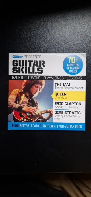 CD de lecciones de guitarra Guitar Skills de Total Guitar. - Incluye That's Entertainment de The Jam. - One Vision de Queen. - Wonderful Tonight de Eric Clapton. - Money For Nothing de Dire Straits. - Twin-Guitar Rock jam track. - Más de 70 minutos de audio de lecciones.