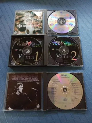 Lote de tres CDs de música española. - CD Nadie es Perfecto de Joan Manuel Serrat. - CD Mucho más que dos de Ana Belén y Víctor Manuel. - CD Grandes Éxitos de Raphael.