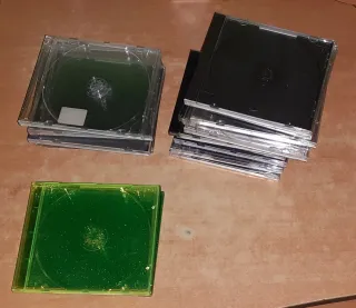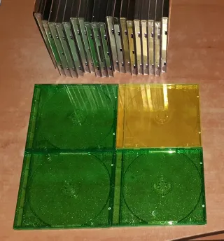 Lote 25 cajas vacias de repuesto para CDs. Hay 4 especiales, 3 verdes con motas brillantes y una amarilla. El resto son las estándar, algunas con bandeja negra y otras transparentes. Alguna está sin usar, otras pueden tener alguna señal leve de uso. Regalo 20 bandejas sujeta cd negras con el lote. Precio NO negociable