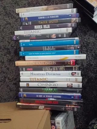 Lote de películas en formato DVD. Dos están repetidas, son 31 títulos: Mientras dormías Cisne negro Gangs of new York Hulk Lo que la verdad esconde Marea roja Gladiator El paciente inglés El dilema 60 segundos El honor de los prizzi enemigos públicos Taxi driver Titanic, X2 Cadena perpetua X2 Que he hecho yo para merecer esto? Tesis Whisky Martín hache La flor de mi secreto Camino a la perdición Ciudad de dios Factótum Dune La escafandra y la mariposa Million dollar baby (en ingles) Atrápame si puedes (en ingles) La mala educacion El último emperador Dogville Lauberge espagnole ( en francés)
