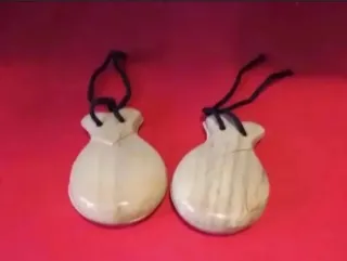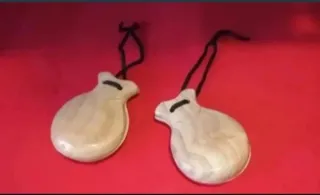 Par de castañuelas de madera. - Fabricadas en madera. - Incluyen cordón para sujetar.