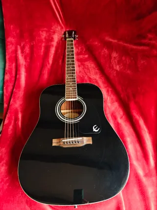 Guitarra acústica Epiphone color negro. Modelo Dreadnaught 'square shoulder' cuerpo y mastil de caoba, tapa de abeto. Cejilla 43mm, roseta multistripe. En buenas condiciones a pesar de la reparación del mastil (ver fotos). Incluye funda.