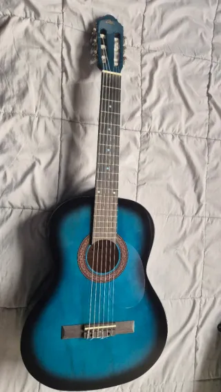 Guitarra clásica de tamaño adulto en llamativo color azul con acabado degradado. - Incluye funda para transporte. - Incluye cejilla. - Incluye púas.