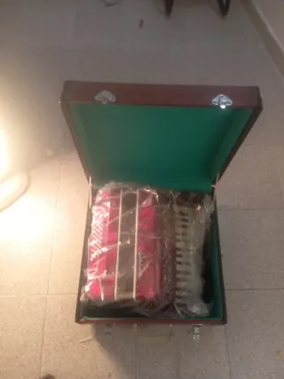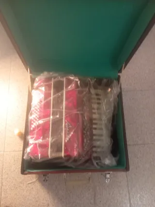 Acordeón rojo, ideal para bailar y disfrutar de la música. - Estuche forrado en verde. - Acordeón cubierto con plástico protector.