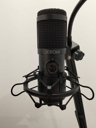 Micrófono de condensador KROM en color negro, ideal para grabaciones. - Diseño elegante en negro. - Incluye araña/soporte antivibración. - Montura ajustable para diferentes ángulos.