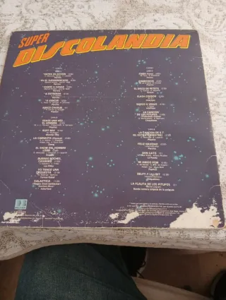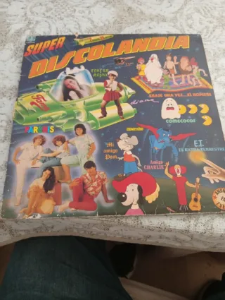 Vinilo LP de Super Discolandia, una recopilación musical. - Contiene 2 discos. - Incluye 25 canciones. - Portada con ilustraciones de Fama, Parchís, Teresa Rabal, Wonder Dog, Comecocos, E.T., Amigo Charlie y Amigo Pom. Tiene roces de uso pero suena bien