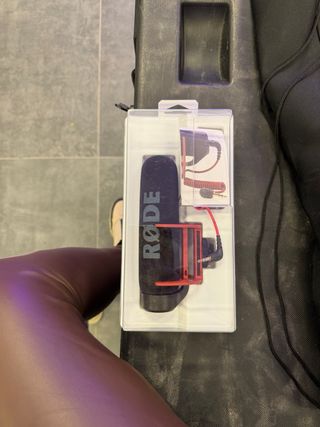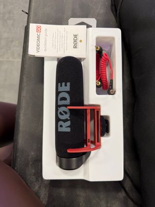 Micrófono Rode VideoMic GO en su empaque original. - Incluye parabrisas de espuma. - Soporte antivibración rojo. - Cable de audio enrollado.