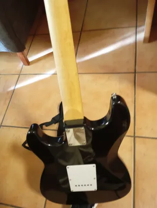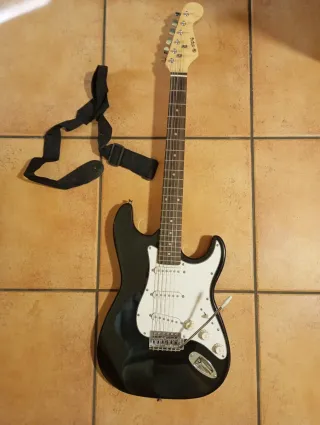 Guitarra eléctrica en color negro, lista para tocar. Le falta una cuerda, pero se entregaría con ella puesta. Incluye una correa para mayor comodidad. Ideal para aprendizaje. Se puede incluir amplificador en lote. - Cuerpo brillante. - Mástil de madera clara. - Tres pastillas. - Puente metálico.