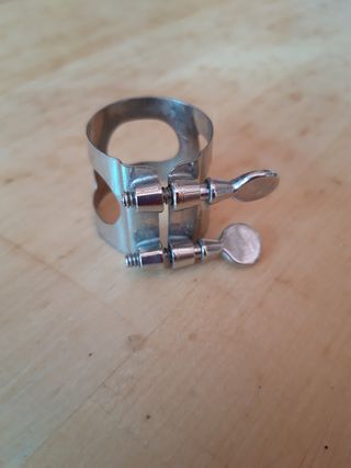 Abrazadera para clarinete Buffet B11. Es de la marca RICO , le falta una palometa Pero está en buen estado. - Fabricada en metal plateado. - Diseño de dos piezas con tornillo de ajuste.