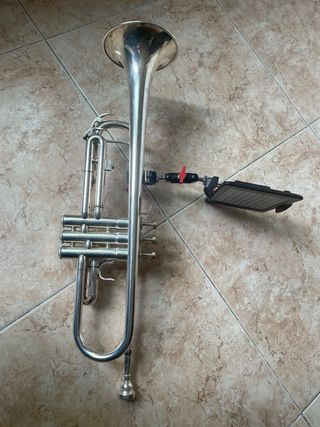 Soporte tipo lira para partituras de clarinete. Fabricado en metal plateado. - Diseño plegable y compacto. - Pinzas de sujeción con goma protectora. - Ajuste mediante tornillos. La compré porque me dijo mi hijo pero nunca se uso. El material plateado está intacto sin arañazos ni rasguños. No negocio.