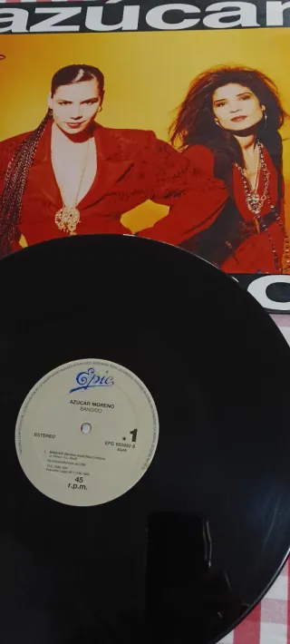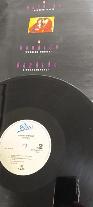 Disco de vinilo del dúo Azúcar Moreno. Bandido - Formato: Vinilo - Velocidad: 45 r.p.m. - Sello: Epic - Referencia: EPC 65588 6