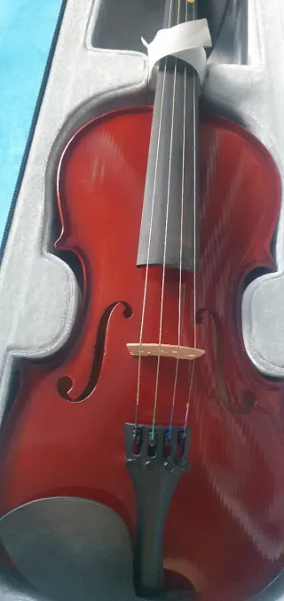 Violín de color rojo oscuro, listo para ser tocado. Incluye su funda y arco. - Funda acolchada para protección. - Arco de madera.
