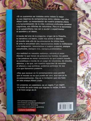 'Si no queremos ser tratados como robots lo mejor es que dejemos de comportarnos como robots', nos dice Albert Lladó. La mecanización de nuestro presente afecta a la burocratización de la vida y provoca profundos cambios cognitivos, aún difíciles de vislumbrar. Pero ni la tecnofobia ni el catastrofismo nos van a ayudar a experimentar el asombro y el deseo. A traves del arte de la pregunta, origen de la filosofía, la narrativa o el teatro, Lladó nos anima a desvelar el mundo más allá de los simulacros de última hora. Si ante la actualidad sólo reaccionamos desde la indiferencia o la resignación, renunciamos a nuestro presente, siempr