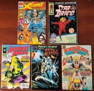 Para coleccionistas. 5 cómics números 1 de su colección: Poderes Cósmicos: Estela Plateada, Wonder woman, Aventuras Marvel: Increible Hulk, Nuevo universo: Star Brand, X-Force. Están como nuevos (observar fotos, las páginas interiores se han abierto tan poco que mantienen la curva), se leyeron y han permanecido en la estantería desde entonces. No muestran defectos en la encuadernación, páginas, tapas, grapas, sin anotaciones, dibujos o marcas de suciedad. NO los vas a encontrar en mejor estado. Cómics del 1988 al 97 que ya no se encuentran. Por separado, 2 cómics 6€ cada uno (pedido mínimo 12€). Número suelto: 10€ la unidad.