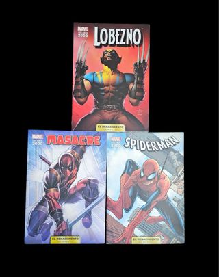 Lote de 3 tomos recopilatorios de cómics de la colección "El Renacimiento de Marvel" enfocada en la década de los 2000, publicados por Panini. Serian Lobezno, Masacre (Deadpool) y Spiderman. Estos tomos se vendieron 2021