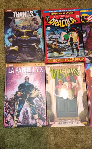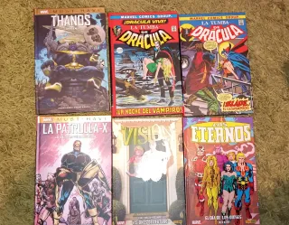 Lote 6 comic tapa dura de Marvel. Los eternos el día de los dioses. La Visión visiones del futuro. La patrulla x la saga de fénix oscura. Thanos origen. La tumba de dracula número 1 dracula vive. La tumba de dracula número 2 blade, el cazamapiros En perfecto estado solo tienen un nombre escribo en la una página