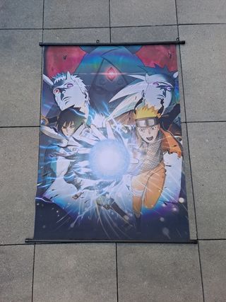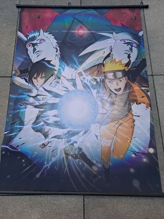 Poster de Naruto con grapas para colgarlo. Es de tela.