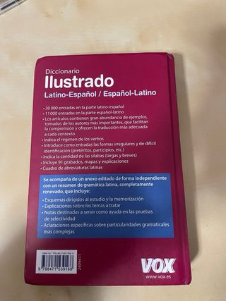 Diccionario ilustrado Latín-Español / Español-Latín VOX. En buen estado general, solo pequeñas marcas de uso en las esquinas (ver fotos). Ideal para instituto o bachillerato. Incluye mapas y explicaciones. Precio ajustado para vender rápido.