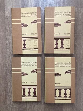 Cuatro tomos del Catálogo de los Monumentos Españoles Declarados Histórico Artísticos 1844-1953.Tercera edición. Madrid 1984.Sin usar de fondo de librería.Totalmente nuevos con la sobrecubierta original, sin marcas ni anotaciones. Con planos,textos y fotos en b/n.Dimensiones de cada tomo:19x29 cms