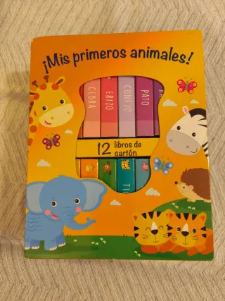 Caja con 12 cuentos infantiles sobre anímales. Libros de cartón, hojas resistentes, perfectas para bebés y peques. Esquinas de la caja un poco magulladas. Historias sencillas con colores llamativos.