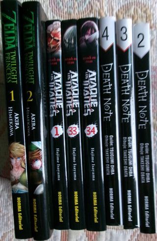 Vendo lote de ocho mangas: tres de de Death Note el nº 2 el 3 y el 4 de Tsugumi Obha (guionista), Takeshi Obata (dibujante), Marc Bernabé Costa (traductor) editados por Norma editorial. Tres más de Ataque a los titanes el nº 1, el 33 y el 34 de Hajime Isayama editado por Norma Editorial también. Y el nº 1 y 2 de La leyenda de Zelda autor Akira Himekawa también editado por Norma editorial. Todos en tapa blanda con sobrecubierta. En muy buen estado de conservación.