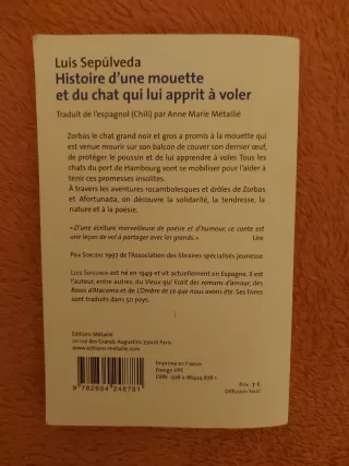 Zorbas le chat grand noir et gros a promis à la mouette qui est venue mourir sur son balcon de couver son dernier oeuf, de protéger le poussin et de lui apprendre à voler Tous les chats du port de Hambourg vont se mobiliser pour l’aider à tenir ces promesses insolites. A travers les aventures rocambolesques et drôles de Zorbas et Afortunada, on découvre la solidarité, la tendresse, la nature et la poésie. Historia de una gaviota y del gato que le enseñó a volar) de Luis Sepúlveda. Es una novela corta y poética, apta para jóvenes y adultos por igual, que aborda temas como la ecología, la amistad y la superación.