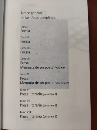 Tomos IV, V, VI, VII y VIII de las Obras Completas de Gerardo Diego. En los 5 tomos se contiene toda la prosa literaria del autor. Alfaguara (Santillana), 1997-2000. Tapa blanda. 21,5 x 13,5 cm. Entre 700 y 1.200 páginas por volumen. En muy buen estado.