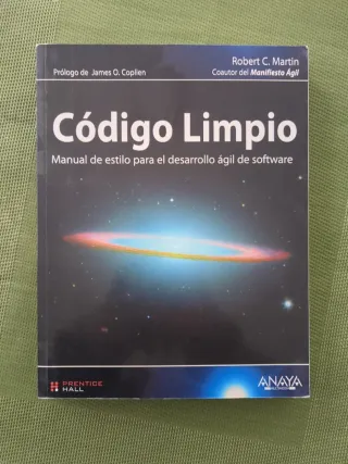 Libro "Código Limpio: Manual de estilo para el desarrollo ágil de software" de Robert C. Martin (el mítico Uncle Bob). Es la "biblia" y lectura obligatoria para cualquier desarrollador que quiera aprender a escribir código profesional, legible y fácil de mantener. Buenas prácticas de programación, refactorización, testeo y desarrollo ágil. Precio original cerca de 50 euros (ver foto trasera)