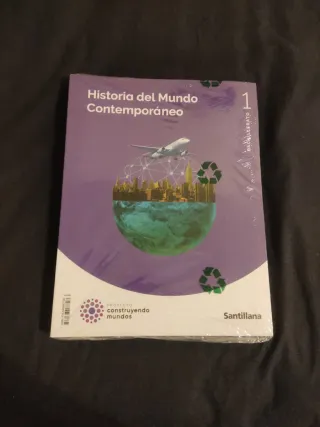 Libro de Historia del Mundo Contemporáneo de 1° de Bachillerato. Completamente nuevo y sin uso, aún en su plástico. Ni manchas ni nada escrito obviamente.