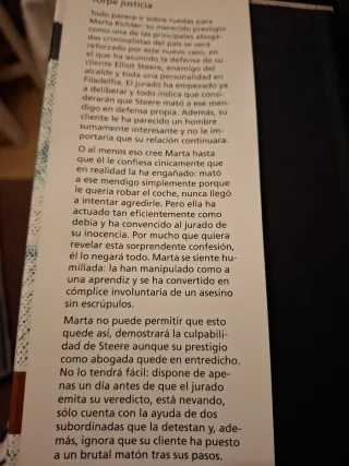 Torpe justicia" (Mistaken Identity en su título original, aunque a menudo referenciado con otras tramas de Lisa Scottoline) es un intenso thriller legal. La trama sigue a la abogada Marta Richter, quien, tras lograr casi la absolución de su cliente, Elliot Steere, por el asesinato de un mendigo, descubre que él es culpable y actuó con frialdad.