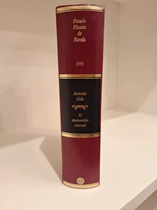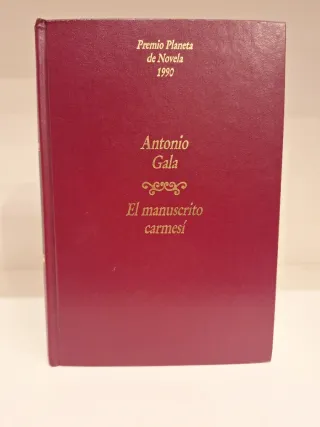 Novela El manuscrito carmesí de Antonio Gala, ganadora del Premio Planeta de Novela en 1990. Firmado por el autor. - Tapa dura de color granate. - Texto dorado en portada.