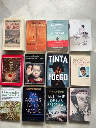 El precio de cada libro es de 7E - El Fanal Hialino. T. Blanda. 1010 Gr - La Gran Ruptura. T. Blanda. 540 Gr. - La cuenta atras para el verano. T. Blanda. 698 Gr. - Una mujer y dos gatos. T. Dura. 440 Gr - El anciano de los dias. T. Blanda. 800 Gr - Los besos en el pan. T. Blanda. 500 Gr - Tinta y Fuego. T. Dura. 600 Gr. - Dentro de cinco horas vere a Jesus. T. Blanda. 390 Gr. - La Revolución conservacionista. T. Blanda. 385 Gr - Las agujas de la noche. T. Dura. 650 Gr. - El linaje de las estrellas. T. Blanda. 400 Gr. - El Maestro y las Magas. T. Dura. 540 Gr REF-CADEI