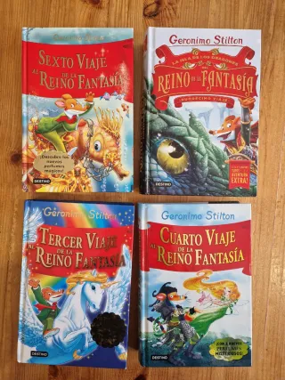 Pack de los 4 libros por 40€. Ver precio unitario. La Isla de los Dragones del Reino de la Fantasía, duodécimo viaje. ISBN 9787408215349. (Precio unitario 12€) Sexto viaje al Reino de la Fantasía. ISBN 9788408102229 (Precio unitario 10€) Cuarto viaje al Reino de la Fantasía. ISBN 9788408087595 (Precio unitario 10€) Tercer viaje al Reino de la Fantasía. ISBN 9788408081210 (Precio unitario 10€)