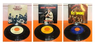 Lote de tres vinilos compuestos por: - Los diablos: Un rayo de sol / Una mañana (Odeon, 1970) - Jose Feliciano - Que será, che sara (1971) - Canciones de la Guerra Civil Española (1978) Tags: disco, discos, vinilo, vinilos, 7 pulgadas, single, pack, musica, discogs