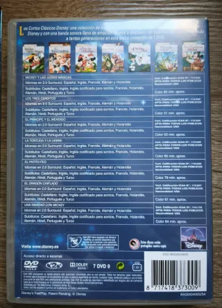Colección de 7 DVDs de cortos clásicos de animación de Disney. - Mickey y las Judías Mágicas - Los Tres Cerditos - El Príncipe y el Mendigo - La Tortuga y la Liebre - El Patito Feo - El Dragón Chiflado - Una Navidad con Mickey