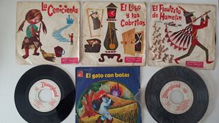 6 Vinilos de cuentos infantiles 1973 4 son cuentos - el lobo y las cabritas - el flautista de hamelin - el gato con botas - la cenicienta y dos son canciones: Blancanieves y los siete enanitos y peter pan - Más discos y cassettes en mi perfil