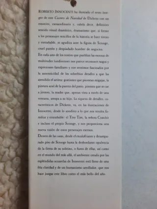 Charles Dickens " Cuento de Navidad" por Roberto Innocenti. pasta dura con sobrepasta. descatalogado La sinopsis de Cuento de Navidad de Charles Dickens narra la historia de Ebenezer Scrooge, un viejo avaro, solitario y cascarrabias que odia la Navidad y todo lo que representa. En Nochebuena, recibe la visita del fantasma de su antiguo socio, Jacob Marley, y luego de tres espíritus: el del Pasado, el del Presente y el del Futuro, quienes lo embarcan en un viaje por el tiempo para mostrarle sus errores y la miseria que ha causado, llevándolo a una profunda transformación y redención para redescubrir la bondad y el verdadero espíritu