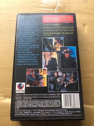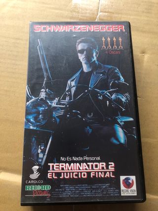 Película VHS de Terminator 2: El Juicio Final. - Incluye la versión en español. - Portada con Arnold Schwarzenegger y referencias a 4 Oscars.