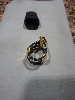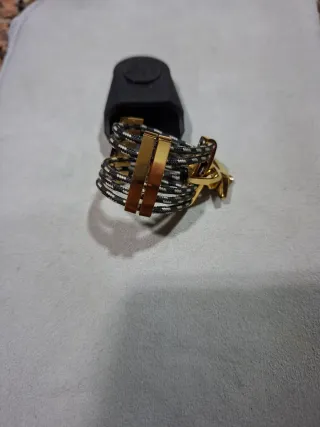 Abrazadera para clarinete Silverstein para boquillas alemanas y Vienesas, con un diseño de cordón trenzado y detalles dorados. - Cordón trenzado en blanco y negro. - Piezas metálicas doradas.
